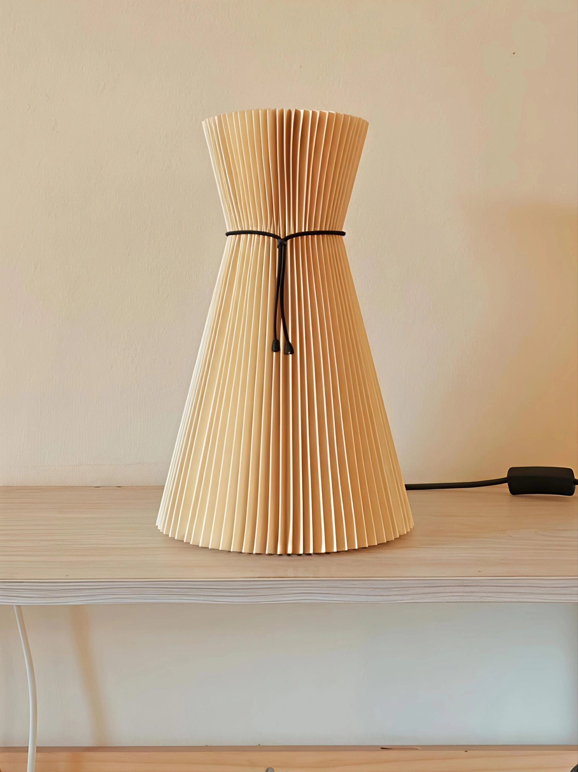 The hand-folded pleated shade creates a soft, architectural dome that gently diffuses light, casting a warm and inviting glow. Paired with a vertically fluted base, the design balances texture and proportion, making it both decorative and functional.